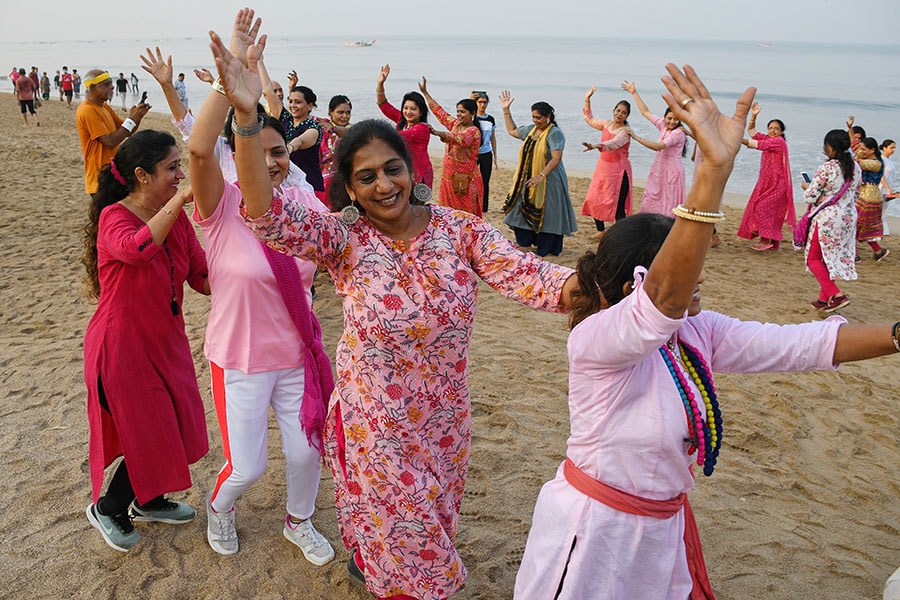 A file photo of women wearing pink performing a Garba dance on Juhu beach in Mumbai. As the group dances in concentric circles with one step in sync, the beat starts slow and speeds up to an energetic rhythm. Garba"s beat is derived from dakla that play at temples in Gujarat.