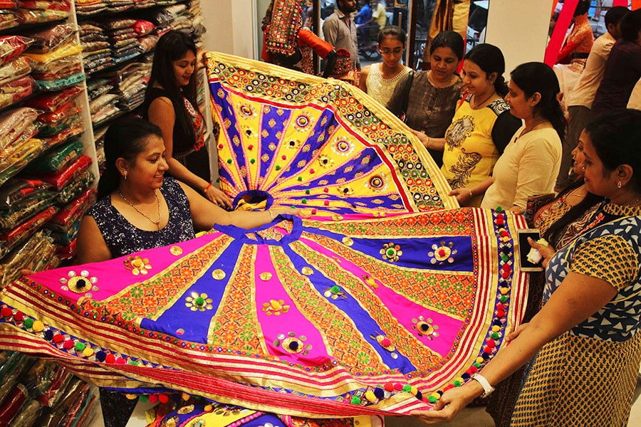 A file photo of shoppers thronging shops that display designer chaniya (flared skirts) for sale for the Garba dance in Thane, Mumbai. The chaniya is usually paired with a choli (blouse) that abounds in intricate embroidery and is decorated with beads, shells and mirrors.