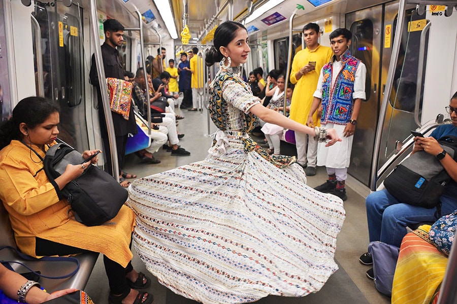 An unusual sight of a performer doing the Garba dance inside the Maha Mumbai Metro train on the first day of the Navaratri festival in Mumbai on October 21, 2023.