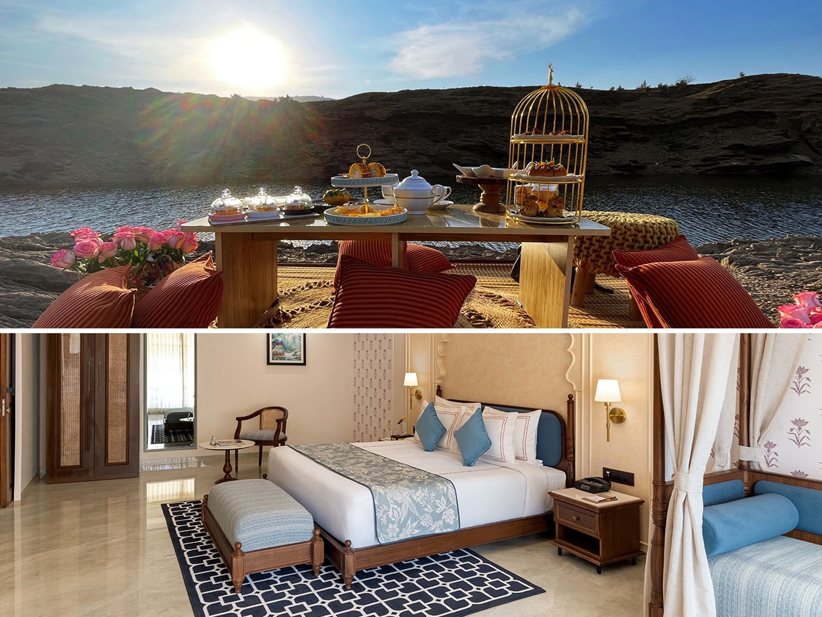Picnic by the Alsigarh lake(top). Traditional elements such as marble inlay and fabric-printed floral headboards complement contemporary bed structures in the Aravalli Suite Image: (top)Veidehi Gite Room:Courtesy Sayaji Hotels