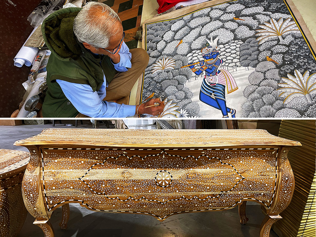 Pichwai artist Arun Sharma painstakingly applies natural pigments, taking weeks or months on Nathdwara’s traditional art (top). A luxury coffee table with floral motifs crafted at a bone inlay workshop.Image: Veidehi Gite