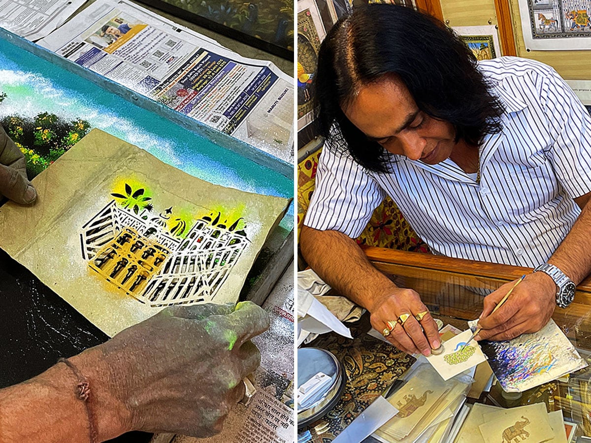 Just fifteen minutes from Sharma’s workshop in Dholi Magri, I witnessed another rare art form indigenous to Udaipur—jal sanjhi, the ancient practice of painting on water. This craft, devoted to Lord Krishna and Udaipur’s grand palace scenes, is kept alive by Rajesh Vaishnav, a 19th-generation artist whose family has safeguarded the tradition for over 500 years. As Vaishnav prepared for a live demonstration, he shared a remarkable detail. “Central to this art are the stencils, and I’m still using the ones my ancestors created 400 years ago," he revealed, carefully placing natural pigments onto the water’s surface. The natural colours, remain afloat for nearly 48 hours, creating ephemeral masterpieces that dissolve with time. While some of his disciples are experimenting with contemporary interpretations of painting on water, Vaishnav’s unwavering commitment to tradition sets him apart. “The depth and generational legacy I bring to this work is what makes me the only artist in India upholding this distinction," he said with quiet pride.