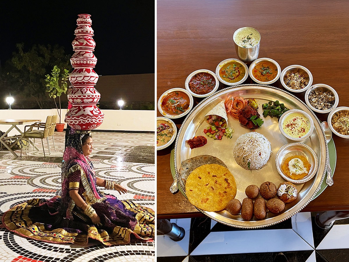 A Rajasthani woman from a snake charming tribe performs ‘Kalbelia’ dance with pots on her head (left). The royal Rajasthani Thali, an opulent spread that exemplifies the legendary hospitality of Mewar.Image: Veidehi Gite