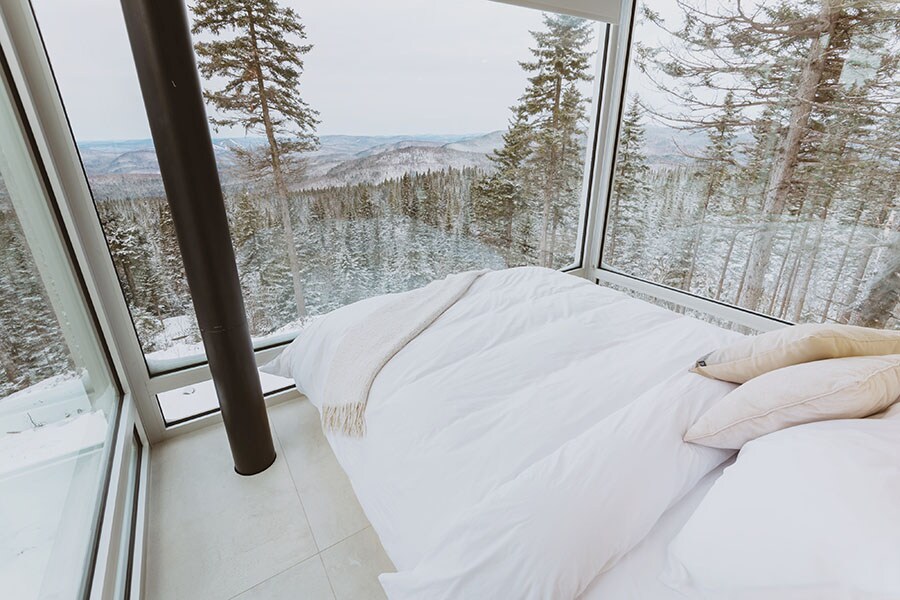 Visitors here can have an immersive experience in nature, around 30 minutes from Old Quebec. The chalet offers spectacular views of Laurentian Park and Beauport Lake. The design of the accommodation is minimalistic, keeping the focus on the natural surroundings.
