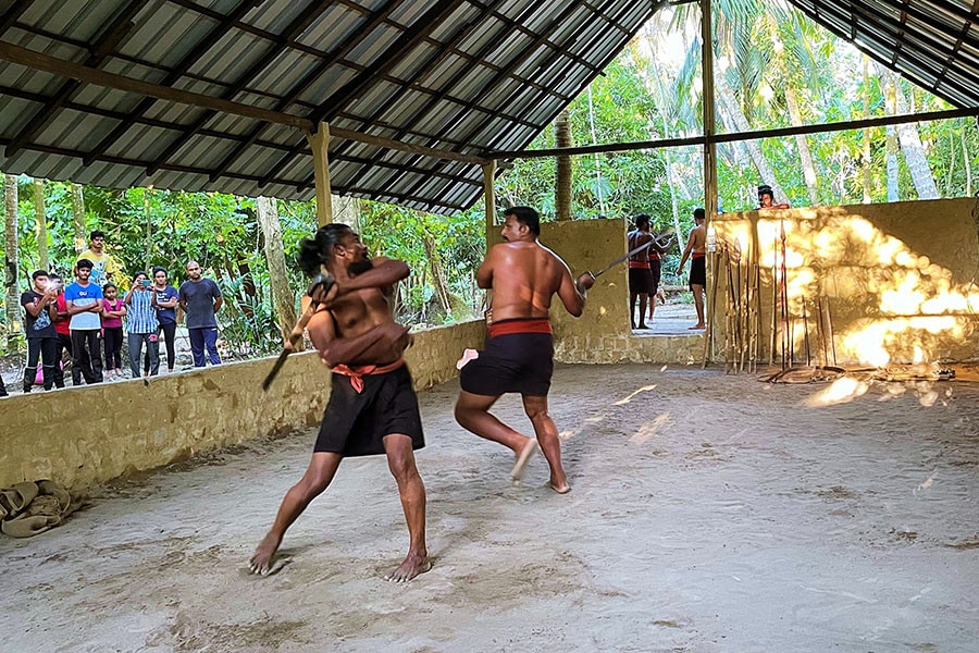 Ravi and Anuruddha’s canes whir through the air like helicopter rotors, rapidly delivering blows as they engage in the ancient martial art. It reminded me of Kalaripayattu from Kerala that shares more than a passing resemblance with Angampora. Both martial arts offer a comprehensive combat system encompassing everything from powerful strikes to intricate locks, takedowns and pressure points.