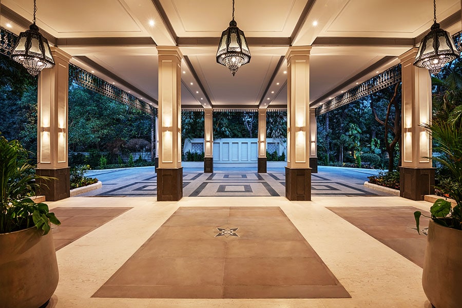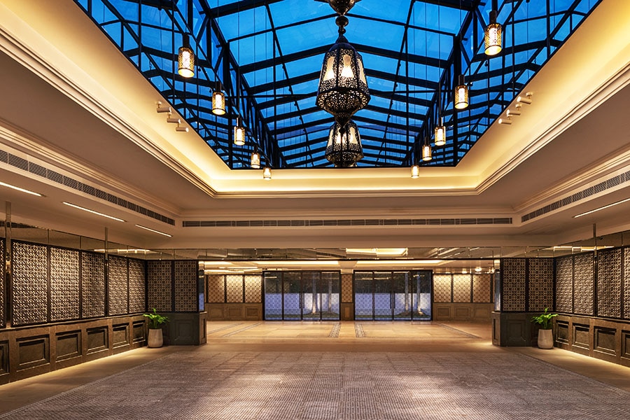 The glass-ceiling vestibules are the venue’s standout features, as they provide natural light, increase ceiling height, and allow for sectioning off areas. Image: Amit Mehra