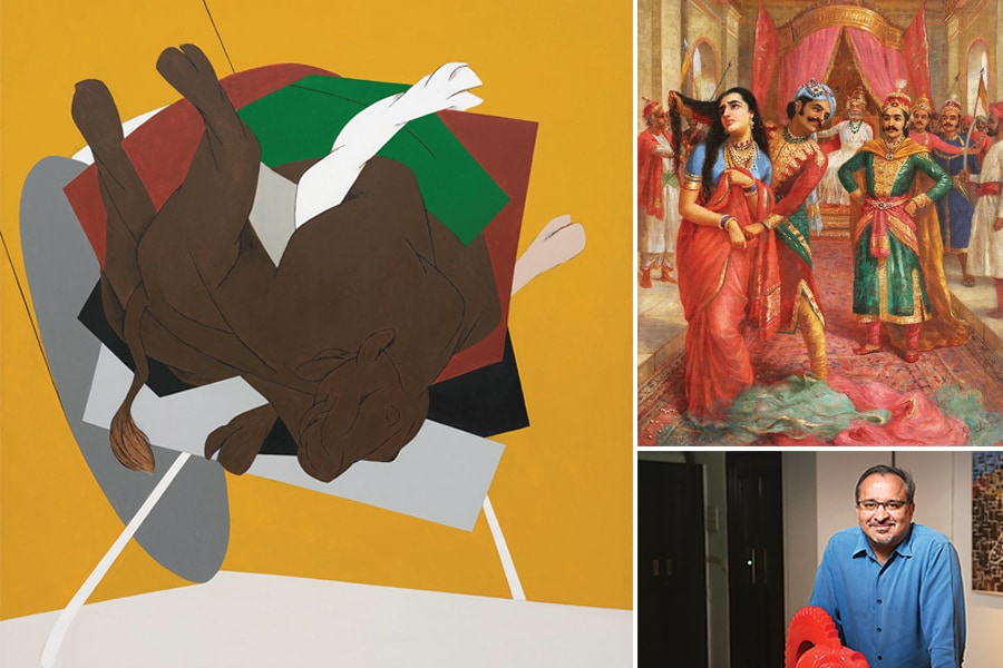 (Clockwise from right) Raja Ravi Varma’s ‘Draupadi Vastraharan’, circa 1888 -1890, oil on canvas Dinesh Vazirani, founder and director of Saffronart Tyeb Mehta’s ‘Untitled (Bull on Rickshaw)’, 1999, Acrylic on canvasImages: Arts: Saffronart, Spring live auction: Modern Indian art, 6 APRIL 2022 Vazirani: Abhijit Bhatlekar Mint via Getty Images