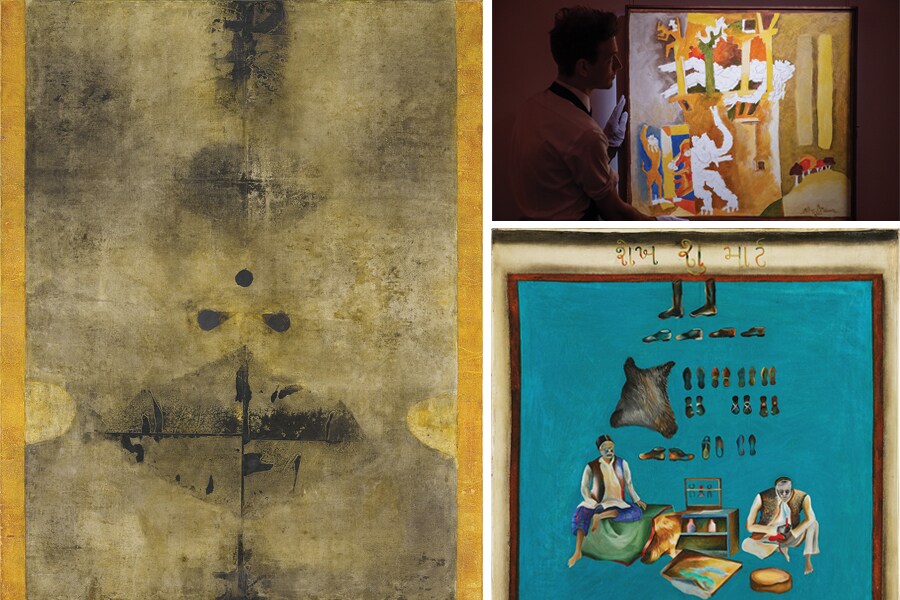 (Clockwise from right) An art handler holds ‘Living Goddess’ by MF Husain, during a preview of Sotheby’s Middle East and India Art Week in London in 2018, Bhupen Khakhar, ‘Sheikh Shoe Mart’, 1977, oil on canvas Vasudeo S Gaitonde, ‘Painting 4’, 1972, oil on canvasImage: Courtesy Sothbey"s Art handler: Chris J Ratcliffe / Getty Images for Sothbey"s