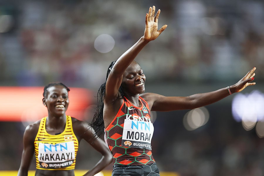 Mary Moraa of Team Kenya dances with joy after winning the Women"s 800m gold at the World Athletics Championship in Budapest, Hungary on August 27, 2023. Many Kenyan fans in the stands danced along with her to celebrate Moraa, who grew up an orphan in a remote area of Kenya. Discovering that her mother, who passed away when Moraa was only two, was a runner, led Moraa to pursue a career in running herself.