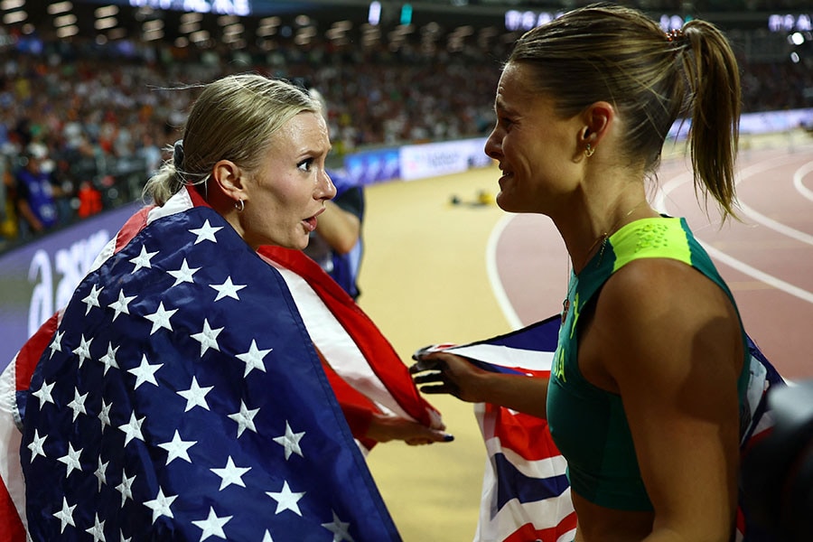 Australia"s Nina Kennedy and Katie Moon of the US celebrate after winning the joint gold in the women"s pole vault final at the World Athletics Championship in Budapest, Hungary, on August 23, 2023. Both flew over the bar on their final attempt at 4.90. Kennedy was quoted asking Moon, “Hey, girl, you maybe wanna share this?" They both agreed to stop jumping and share the win. "It"s funny because, until the Olympics, I never realised you could split a gold medal," said Moon.