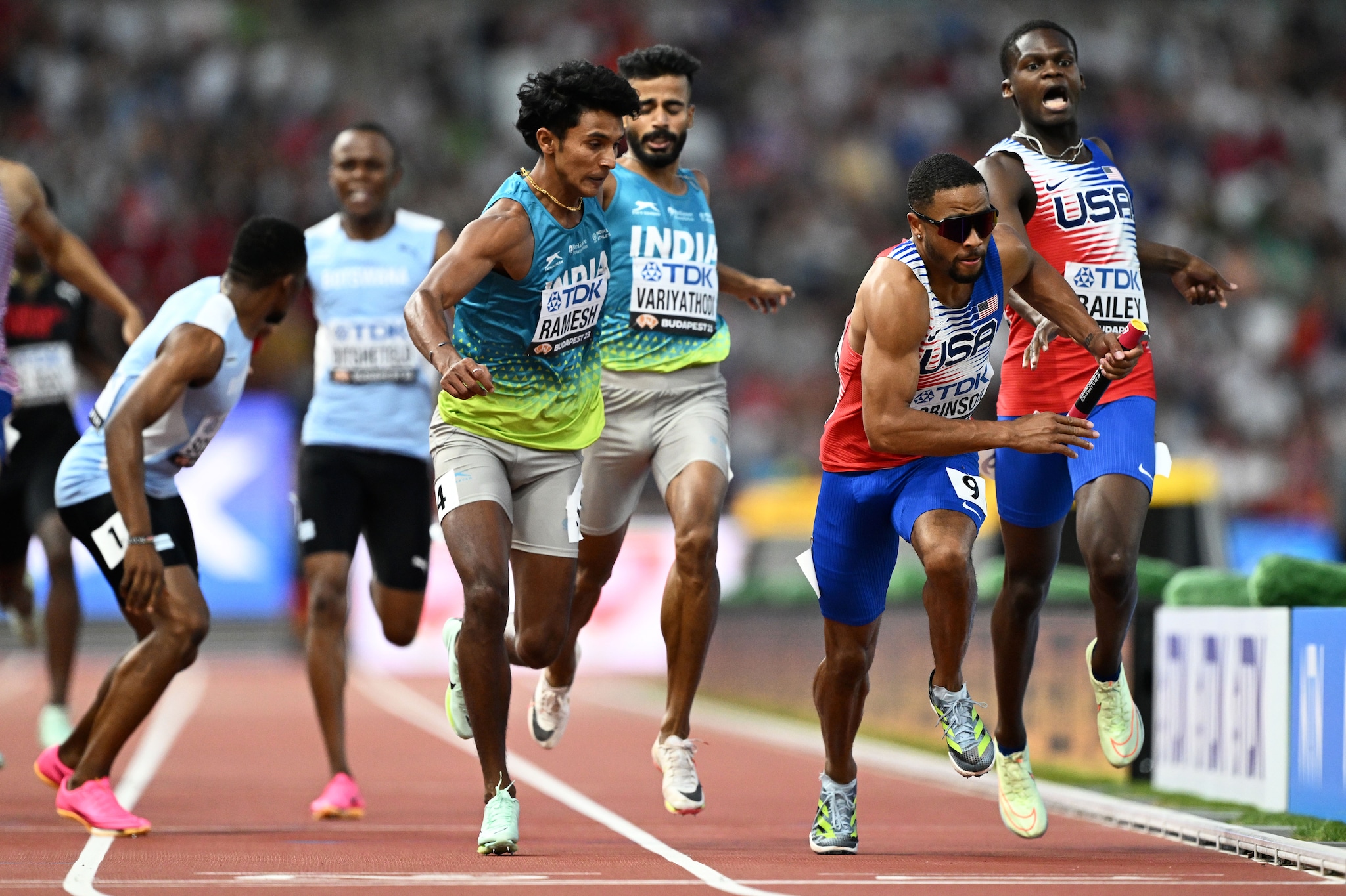 India"s Muhammed Ajmal Variyathodi passes the baton to Rajesh Ramesh in the men"s 4x400m relay heats during the World Athletics Championships in Budapest, Hungary, on August 26, 2023. The relay team, which consisted of Rajesh Ramesh, Muhammed Ajmal Variyathodi, Amoj Jacob, and Muhammed Anas Yahiya, finished finishing fifth in the final, breaking the Asian record with a time of 2:59:05.