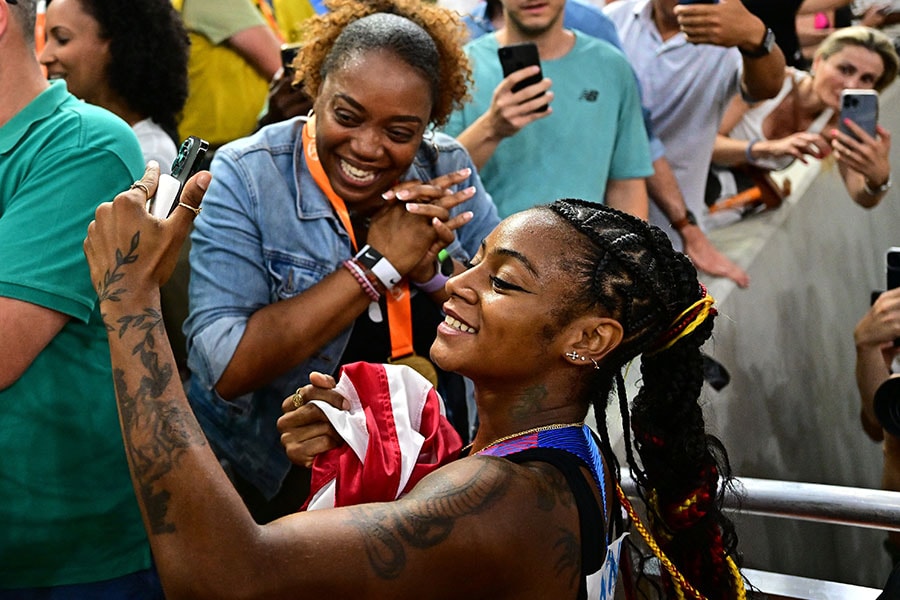 Sha"carri Richardson of the US celebrates after winning the women"s 100m final at the World Athletics Championship in Budapest, Hungary, on August 21, 2023. Richardson also earned a bronze in the 200m and then turned in a clutch performance to anchor the winning US 4à—100-meter relay. “This journey for me is just knowing that no matter what happens, you never lose sight of yourself," she told NBC Sports. “Never lose sight of your faith. Always remember why you started."