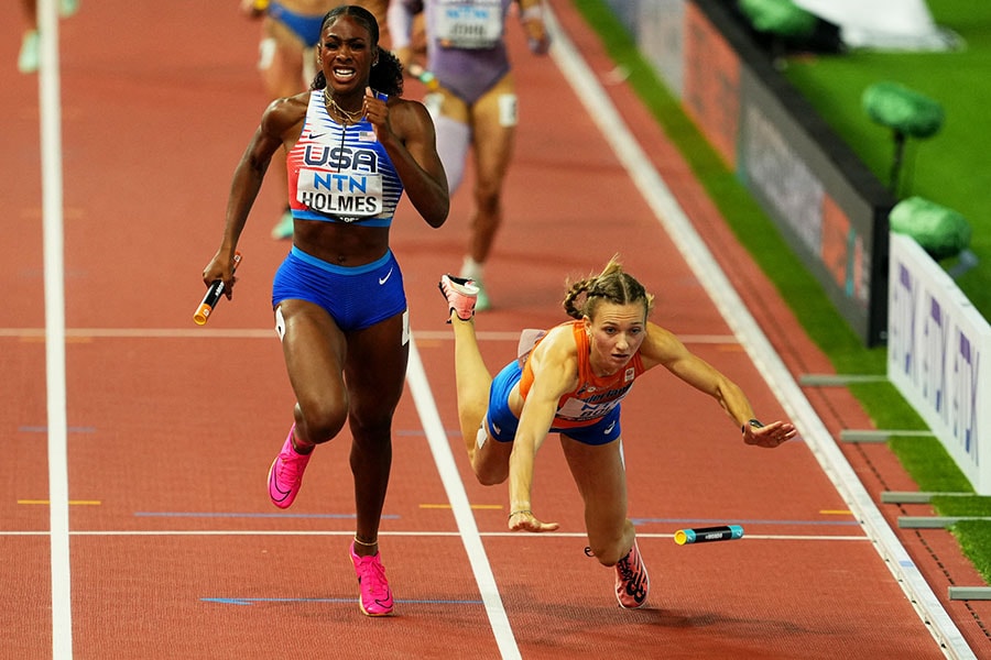 Netherlands" Femke Bol falls on her face (seen here mid-fall) a few metres from the finish line during the fourth and final leg of the mixed 4x400 metres relay final at the World Athletics Championship in Budapest, Hungary, on August 19, 2023. But redemption came her way five days later, when she flawlessly won the 400-meter hurdles in 51.70 seconds, the second-fastest time in history. Then Bol anchored the Dutch women"s 4à—400-meter relay team to a gold-medal finish in a national record and world-leading time of 3:20.72.