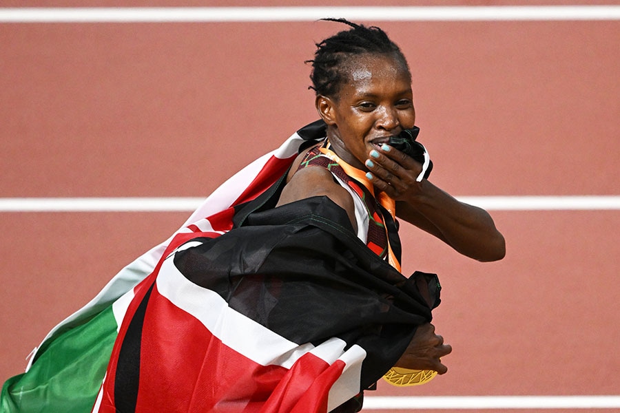 Kenya"s gold medallist Faith Kipyegon celebrates with a national flag after the women"s 5000m final during the World Athletics Championships in Budapest, Hungary, on August 26, 2023. The 29-year-old mother is arguably the greatest women"s middle-distance runner in history, becoming the first woman ever to win 1500m and 5000m double, capping a remarkable season in which she broke three world records in the 1,500m, mile, and 5,000m.