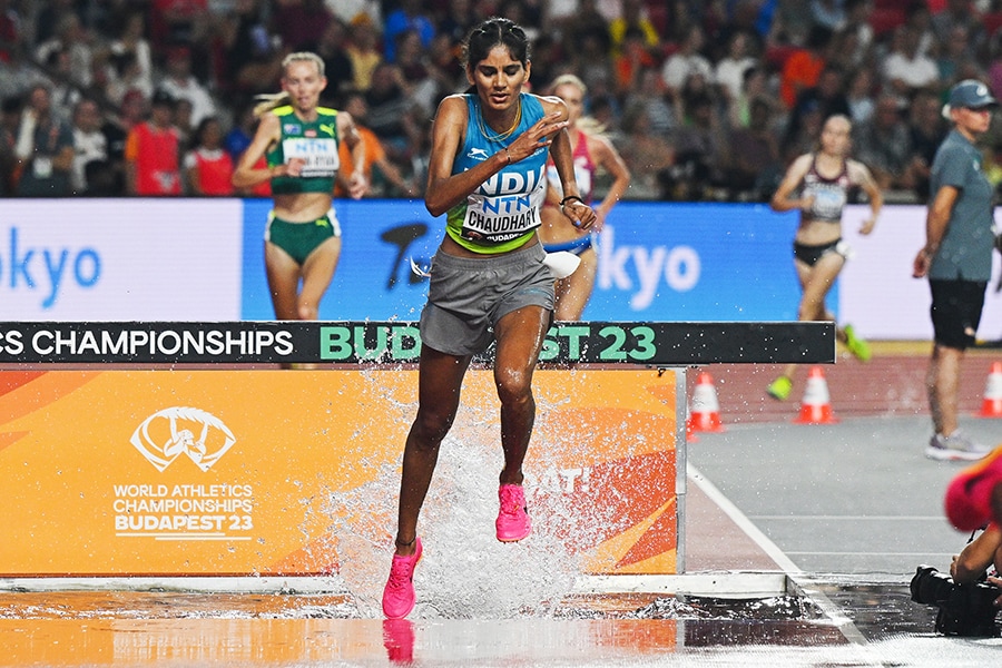 India’s Parul Chaudhary competes in the Women"s 3000m Steeplechase Heats during the World Athletics Championships in Budapest, Hungary, on August 23, 2023. Chaudhary broke the national record in women’s steeplechase with a timing of 9:15:31 and qualified for the Paris Olympics, a testament to her perseverance and dedication, despite her modest beginnings as the daughter of a farmer from Iklauta village near Meerut, Uttar Pradesh.