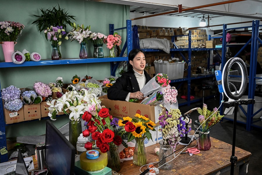 Boxes of roses, lilies and carnations pile up as influencer Caicai speaks into her smartphone from a small studio at Asia"s biggest flower market—with thousands of customers eagerly awaiting her view on the best deals.