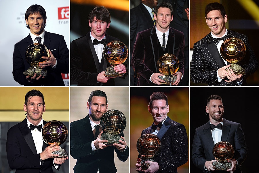 This photo collage shows Barcelona"s Argentinian forward Lionel Messi receiving the Ballon d"Or football award for a record-extending eight times (top, L to R) for the year 2009 in Boulogne-Billancourt, outside Paris, on December 6, 2009 for the year 2010 in Zurich, on January 10, 2011 for the year 2011 in Zurich on January 9, 2012 for the year 2012 in Zurich on January 7, 2013 (bottom L to R) for the year 2015 in Zurich on January 11, 2016 for the year 2019 in Paris on December 2, 2019 for the year 2021 in Paris on November 29, 2021 and for the year 2023 in Paris on October 30, 2023.