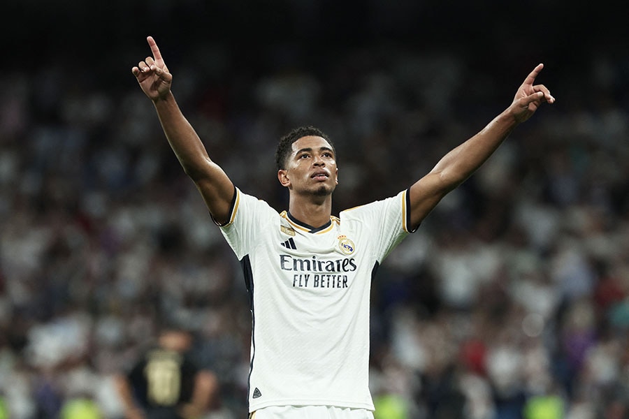 Real Madrid"s English midfielder Jude Bellingham celebrates scoring his team"s first goal during the UEFA Champions League this year. Bellingham won the Kopa Trophy for the best male U-21 player at the Ballon d"Or awards ceremony.