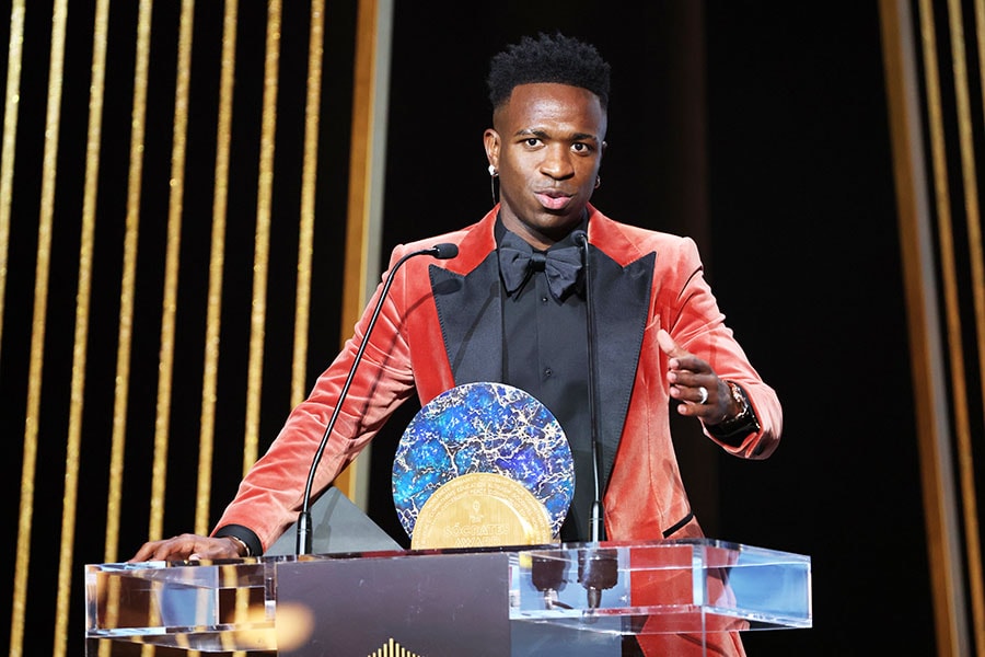 Real Madrid and Brazil"s soccer star Vinicius Junior onstage at the 67th Ballon d"Or Ceremony. Vinicius Junior won the Socrates Award for his leading action to fight racism and make football a more tolerant sport.