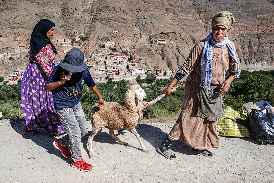 Survivors of Morocco"s devastating earthquake, villagers transport a reluctant lamb donated to them near Amizmiz, Morocco, on September 13, 2023. The 6.8 magnitude earthquake caused rocks to block mountain roads, making it impassable for rescue teams to reach remote mountain villages that were devastated.
