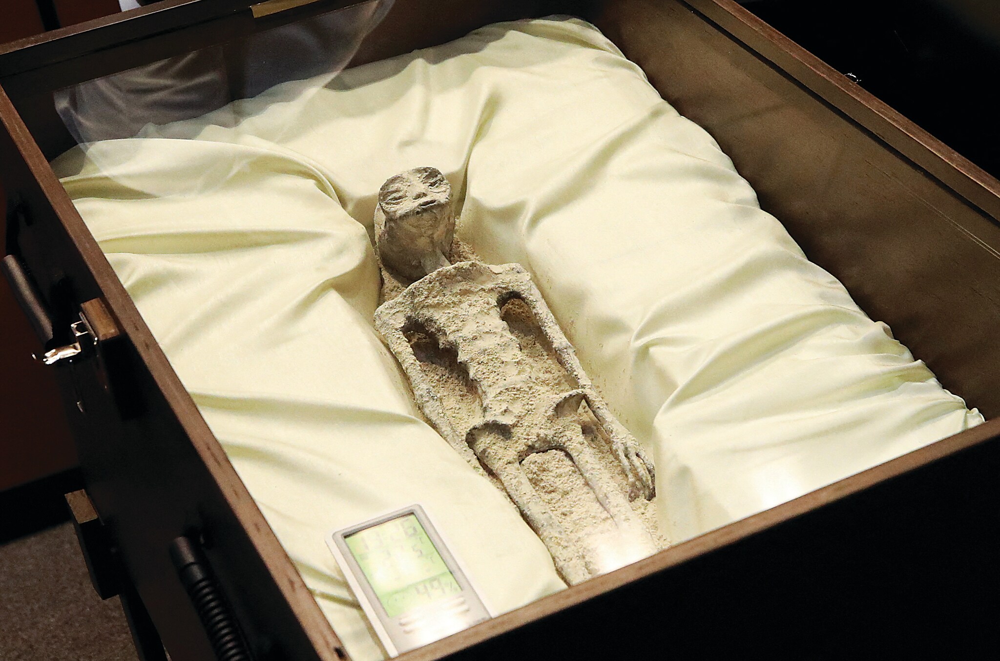 A small figure in a box described by journalist and UFO researcher Jamie Maussan as "non-human" beings found almost a decade earlier in Peru are presented at a hearing in the Mexican Congress" Chamber of Deputies on September 12, 2023. Many scientists express scepticism, saying many details about the figures "made no sense". In 2017, Maussan made similar claims, which were found later to be "recently manufactured dolls, which have been covered with a mixture of paper and synthetic glue to simulate the presence of skin."