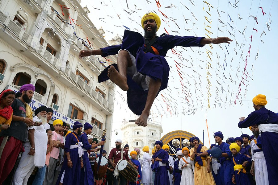A Sikh man performs martial art known as "Gatka" during a procession at the Golden Temple in Amritsar on September 16, 2023, on the occasion of the 419th anniversary of the installation of the holy book "Guru Granth Sahib". The recent announcement by the Indian Olympic Association (IOA) to include gatka in the 37th National Games has sparked joy among city residents and gatka enthusiasts.