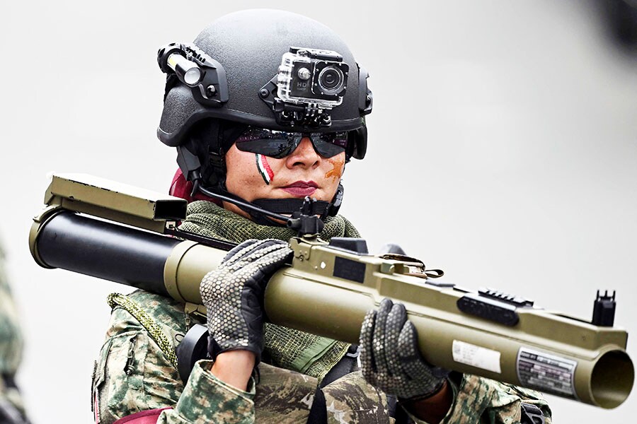 A soldier of the Mexican Army takes part in the military parade for the 213th anniversary of independence at Zocalo Square in Mexico City on September 16, 2023. Celebrating their nation"s hard-won independence from Spain, families across the country were serenaded by mariachi bands, partaking in rich cultural performances, parades, and traditional food
