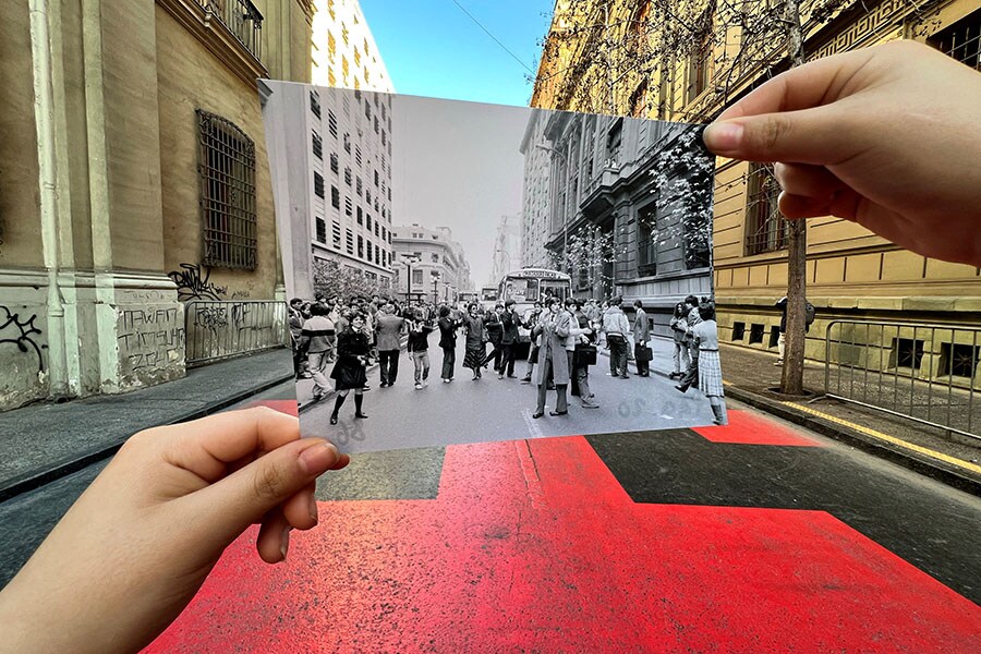 An archival photograph of a protest against Pinochet"s dictatorship in downtown Santiago, Chile, in 1986 ( provided by Documentation and Archive Foundation of the Vicarage of Solidarity) is superimposed on a photograph of the same location as seen today, September 10, 2023.