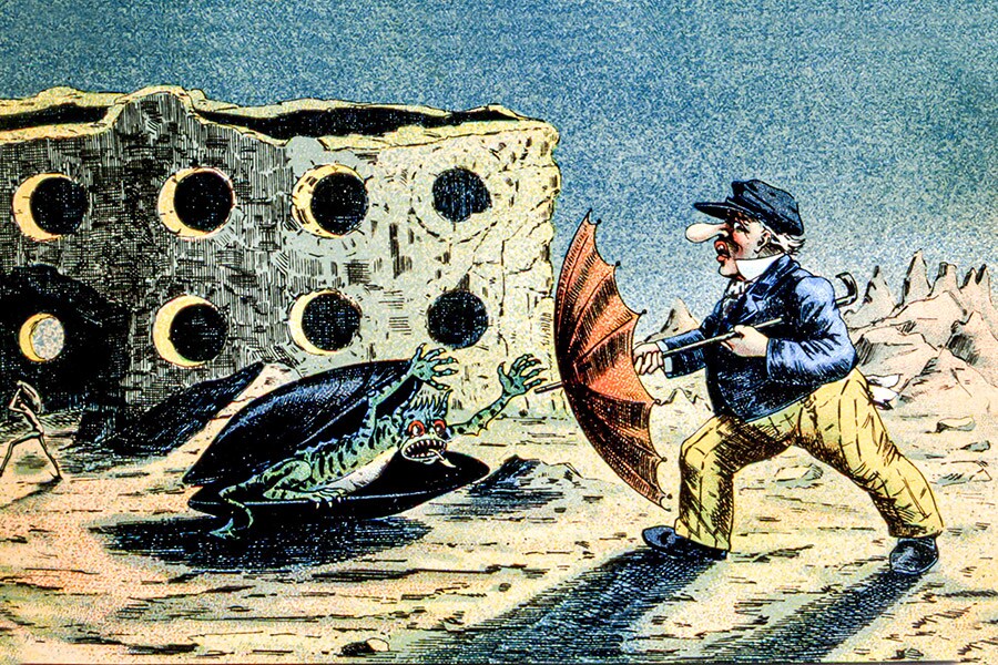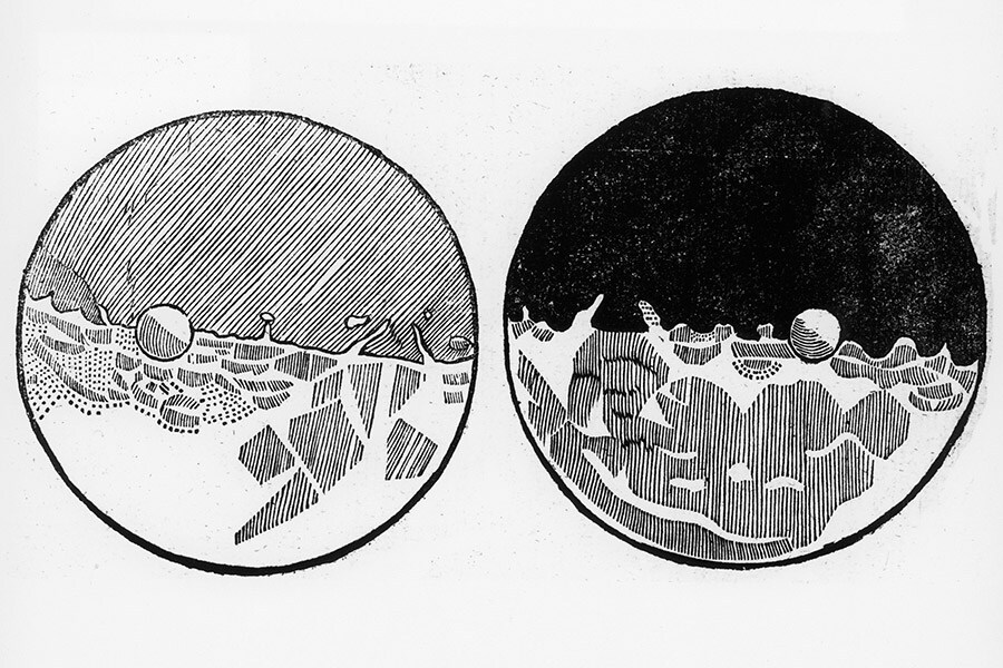 The scientist academician Monsieur Babulifish encounters strange creatures on the Moon in the book "Journey to the Moon on the eve of 1900". These fantastic drawings by the author A. de Ville d"Avray became a sought-after publication in the history of science fiction after its release in 1892.