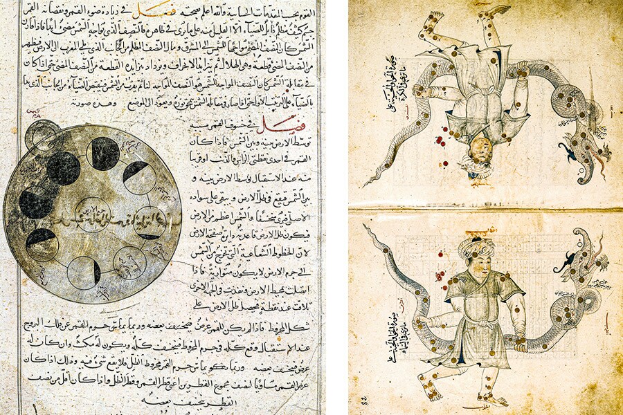 Astronomy pioneers in Islamic civilisation built powerful observatories and named galaxies, stars and features on the moon. 1. Phases of the moon, miniature from the Wonders of Creation, Arabic manuscript, 14th Century. 2. Miniature from the Book of Fixed Stars, by Azophi (Abd al-Rahman al-Sufi), Arabic manuscript, 11th Century.