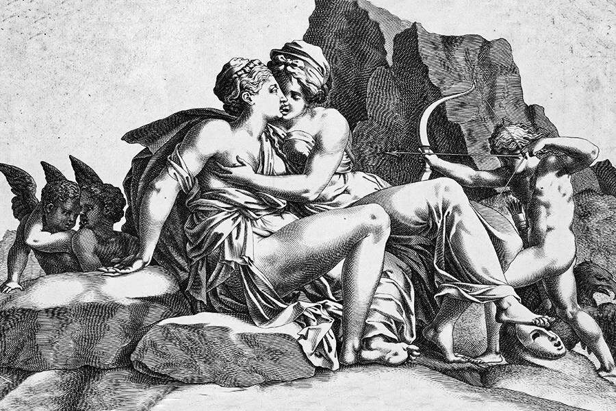 Pierre Milan’s engraving of Callisto and a disguised Jupiter. In this painful Roman myth, Jupiter—disguised as Dianam the Goddess of Moon and Chastity—seduces Callisto, a nymph who had sworn to remain unwed, and violates her. A pregnant Callisto is turned into a bear and killed by an enraged, jealous companion. Jupiter swoops down, takes Callisto’s body, and sets it in the sky as the “Great Bear"—Ursa Major.