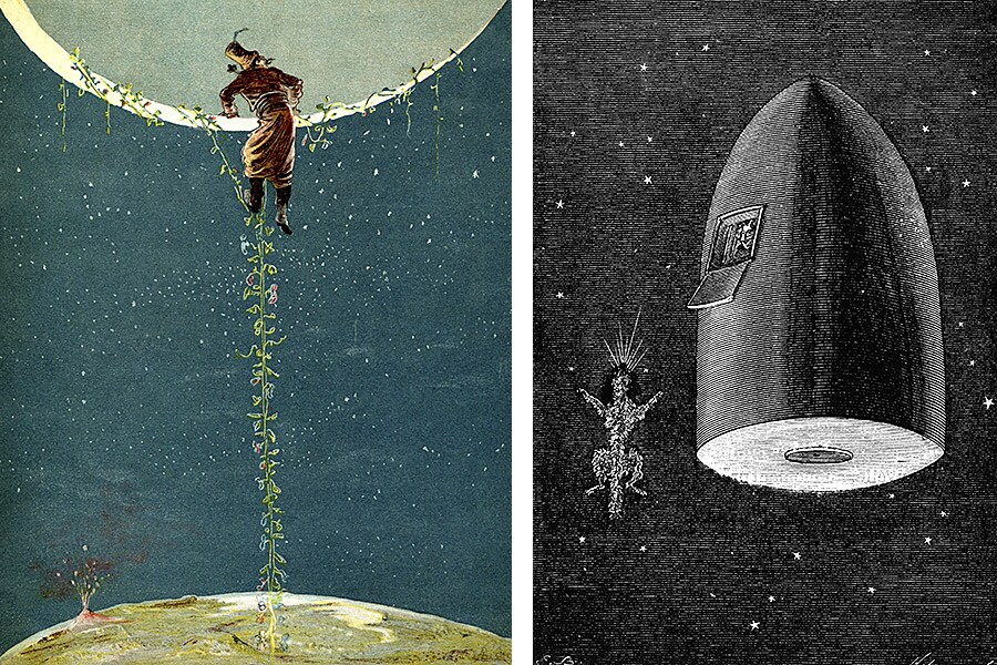 (left) The Baron climbs up to the moon by way of a quickly growing Turkey bean plant, to find the missing honey bee thats flown upwards, to the moon. Illustration by Alphonse Adolf Bichard from the book The Adventures of Baron Munchausen published c1886.