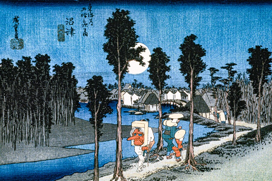 ‘Moon at Numazu" from the series "The Fifty-three Stations of Tokaido", c1832. In a tree-lined road by a river bathed in the light of the full moon, pilgrims walk towards the town. Coloured woodblock print by Ando Hiroshige, Japanese artist, and printmaker.