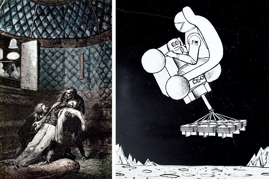Illustration from "From the Earth to the Moon" by Jules Verne, 1865. There’s an emergency in the padded interior of the space capsule "Columbiad" as one of the astronauts loses consciousness.