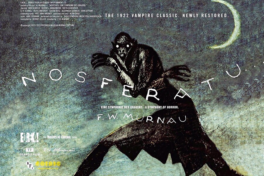 Poster shows the actor Max Schreck in the film "Nosferatu: A Symphony of Horror". The 1922 silent German expressionist horror film was also the first film to show a vampire dying from exposure to sunlight. Previous vampire novels such as Dracula had shown them being uncomfortable with sunlight.