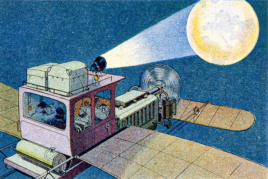 An early 20th-century trade card imagining fashionable travel in 2012: Returning to the moon in a private biplane. In eight hours it has been possible to go to Paris and buy Chocolat Lombard before returning back to the moon in a private biplane.