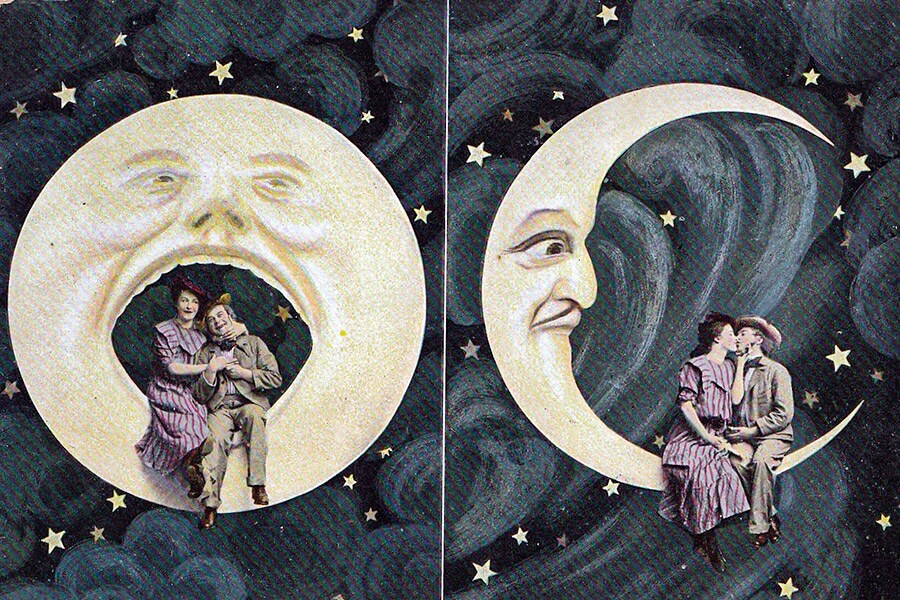 Illustrated photo postcard published in 1907 titled "Spooning the Moon" depicts a humorous and romantic couple kissing while posing on a large paper moon.