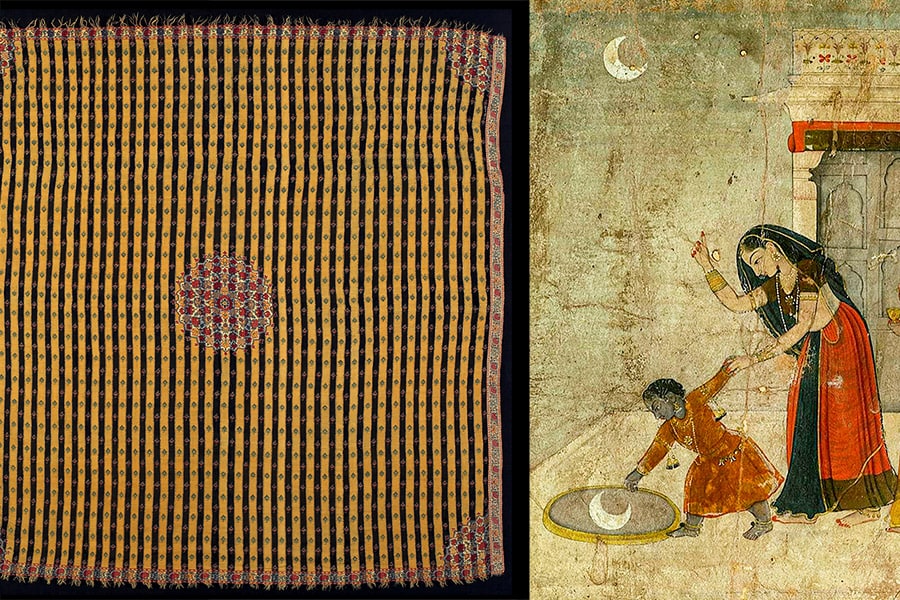 The child Krishna rushes to catch a reflection of the moon that his mother Yashoda points to. Indian miniature painting, Kangra region, Himachal Pradesh, 18th century.