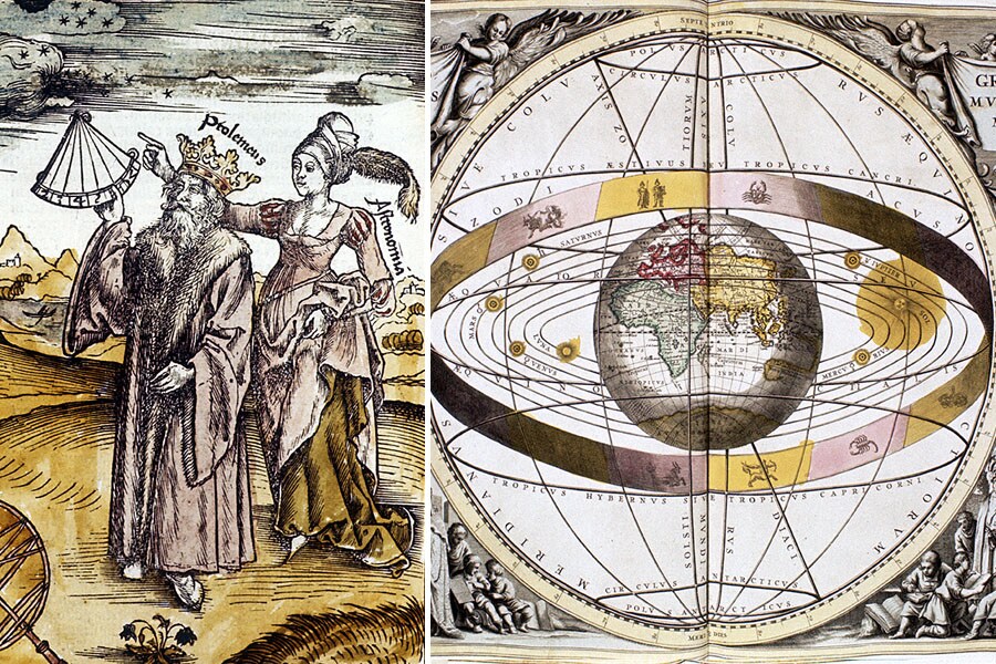 Claudius Ptolemy, a 2nd Century Greek mathematician, astronomer, and geographer uses a quadrant to observe the moon and stars, instructed by Urania, the Muse of Astronomy. On the right, an illustration shows the position of the sun, moon, and planets and the band of the ecliptic. Proposed by Claudius Ptolemy in the 2nd Century AD, his theory of Earth-centred arrangement of the Universe was accepted scientific wisdom until Nicolaus Copernicus (1473-1543) proposed his alternative sun-centred model in 1543.