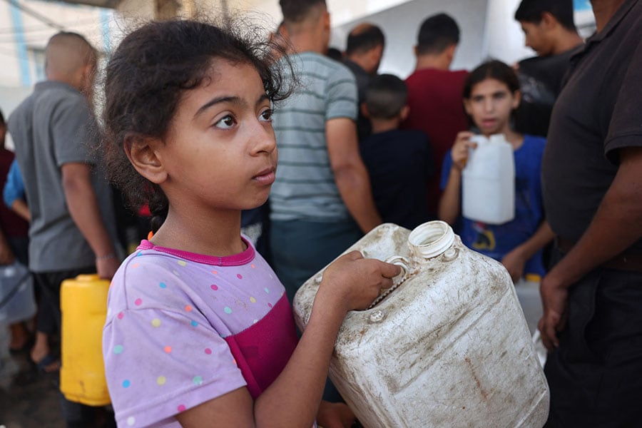 A Palestinian girl waits to collect portable water in Khan Yunis, in the southern Gaza Strip, on October 26, 2023, amidst reported damage to water infrastructure, including pump stations, groundwater network and desalination plants, during the ongoing battles between Israel and the Palestinian group Hamas. UNICEF reported that 96 percent of the water from Gaza"s aquifer is now unfit for human consumption and only a tenth of Gazans get direct access to safe water, and children are the worst victims.