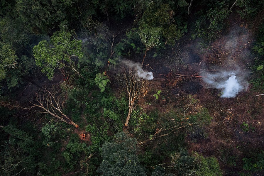 This aerial photograph shows an area devastated by logging in Kahuzi-Biega National Park, Democratic Republic of Congo. The tropical rainforest in the Congo River basin is the world"s second-largest, stretching over six central African countries. It can absorb 4 percent of global carbon dioxide emissions every year. Sixty percent of this precious forest, which falls within the DRC, has been ruined by deforestation, illicit trade of timber and wildlife poaching by armed groups. The conflict between these groups and the Congolese army has led to the internal displacement of millions, many of whom have fled to the rainforest, where they have cleared land for farming and used wood for fuel, further exacerbating deforestation.