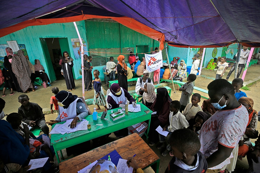 People who fled ethnic clashes in Sudan"s Blue Nile state wait at a clinic set up by health authorities in collaboration with Medecins Sans Frontieres (Doctors Without Borders) at a camp for displaced people in Damazin, in the Blue Nile state, Sudan, on August 7, 2022. In a complex conflict involving deep-seated grievances and battles for power, rival groups fight over territorial control of natural resources and critical minerals easily exploited for economic gain without considering the consequences on the land. UNEP research shows at least 40 percent of all internal conflicts over the last 60 years can be linked to exploiting natural resources.