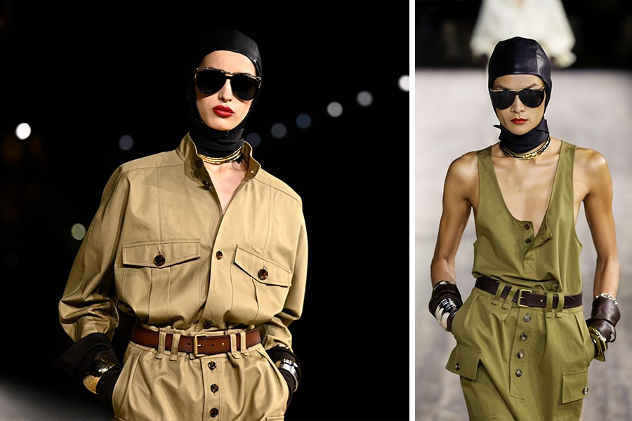 Saint Laurent"s opulent nighttime show featured a pilot aesthetic, safari-style jumpsuits and cargo trousers inspired by female aviation pioneers Amelia Earhart and Adrienne Bolland. The typically masculine look was feminised with waist-defining leather belts, oversized gold jewellery and towering stilettoes.