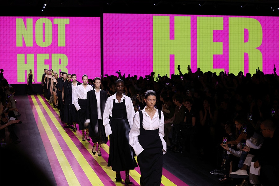 Dior designer Maria Grazia Chiuri presented a largely monochromatic palette of straight masculine jackets, pleated skirts and plenty of knitwear broken up by unexpected, breezy prints. The show was wrapped around a video installation by artist Elena Bellantoni referencing unconventional women, typically considered dark or dangerous.