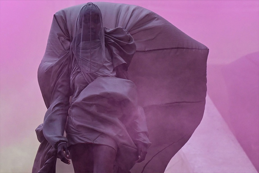 Gothic elegance rang through Rick Owens" vision of a dark universe ignited by a tinted fog and cinematic flair. Oozing with futurism, the volumetric curved garments, lattice-like embellishments and leather bottoms in bold red, burgundy, and pink embraced the dystopian age gladly.
