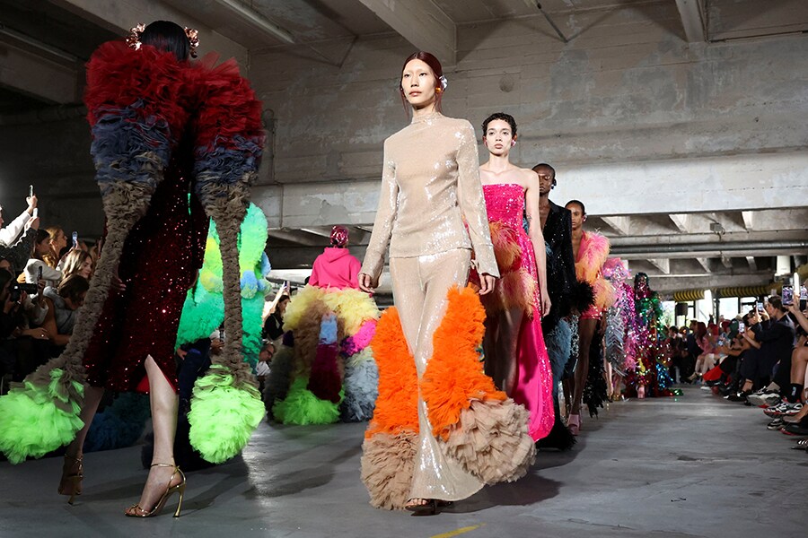 Neon-hued marine gastropods were Kevin Germanier"s muses for his spring creations. No wonder his exuberantly surreal display was perfect for a rave in space! Frothy orbs of fabric, extremely detailed crystal headpieces, elaborately beaded dresses and boots, this graduate brought fantastical elements and recyclable materials to his debut at the week.