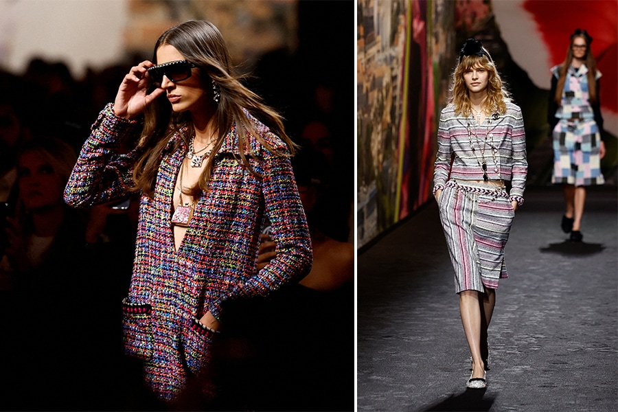 Virginie Viard"s latest collection for Chanel is an ode to a relaxed summer day vibe on the French Riviera, with the classic Chanel tweed appearing as floor-length kaftans, striped sequin trousers in North African-inspired geometrics, patterned capes and flip-flops for daytime!
