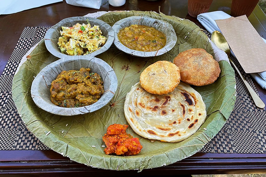Available in three delectable combinations, Agra’s traditional breakfast was served on an eco-friendly and biodegradable leaf-stitched plate at Tajview Agra. Image: Veidehi Gite