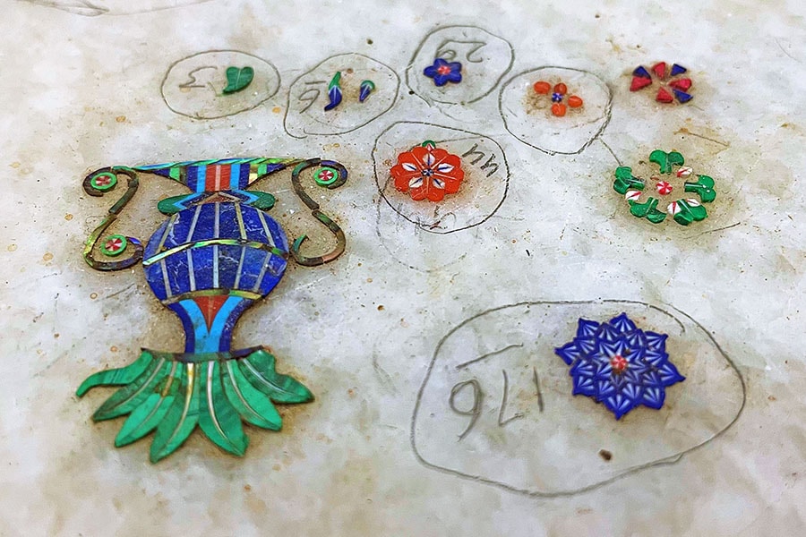 Sharma proceeds to display some of the smaller stone pieces, explaining, "While it"s relatively straightforward to hold larger stone pieces between the tips of the ring finger and thumb, for the smallest components of the inlay work, artisans grip them between the tips of their nails." He adds that as they shape the stone with their nail tips, the proximal phalanx of their thumb remains in contact with the stone"s hard surface, which is why they avoid using machines. “The high-speed rotation of machines poses a risk of injury to their fingers. Engaging in handwork, they spend 10-15 minutes slicing the stones, then take a break before resuming. This meticulous process demands intense concentration even the slightest mistake necessitates starting anew."
