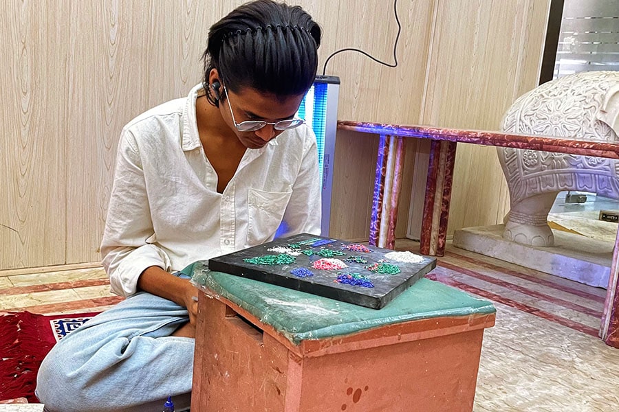 Mohammed Zaid meticulously arranges the small pieces of semi-precious stones, preparing them for adhesion onto the intricate design. Image: Veidehi Gite